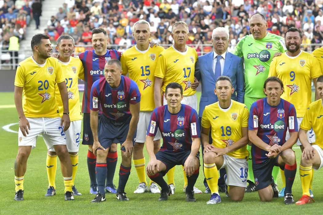 Nicolae Constantin Dica, Catalin Constantin Munteanu, Mirel Matei Radoi, Adrian Iencsi, Emil Sandoi, Anghel Iordanescu, Dumitru Stangaciu, Viorel Moldovan, Ciprian Marica, Adrian Bucurel Ilie, Constantin Galca, Paul Florentin Codrea si George Ogararu la o fotografie de grup realizata inaintea meciului de fotbal dintre Legende Steaua Bucuresti si Legende Romania desfasurat cu ocazia implinirii a 75 de ani de existenta a clubului militar, pe Stadionul Ghencea-Steaua din Bucuresti, marti 7 iunie 2022. © FOTO:Razvan Pasarica/SPORT PICTURES