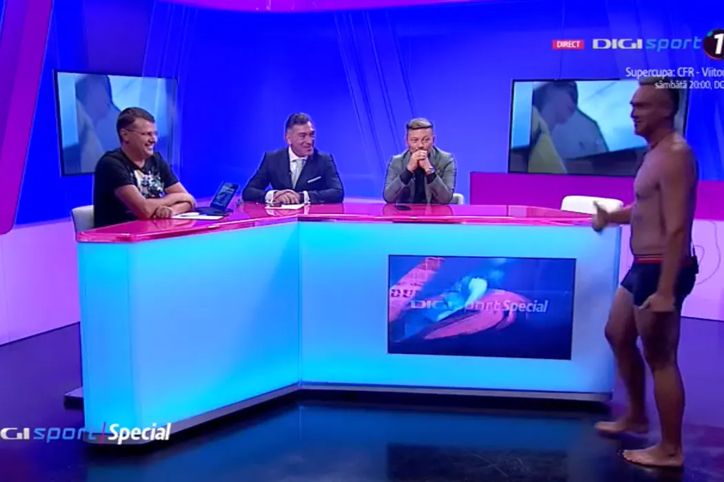 Apariție surprinzătoare la TV! Jurnalistul a apărut în lenjerie intimă, după ce a pierdut pariul cu Ilie Dumitrescu