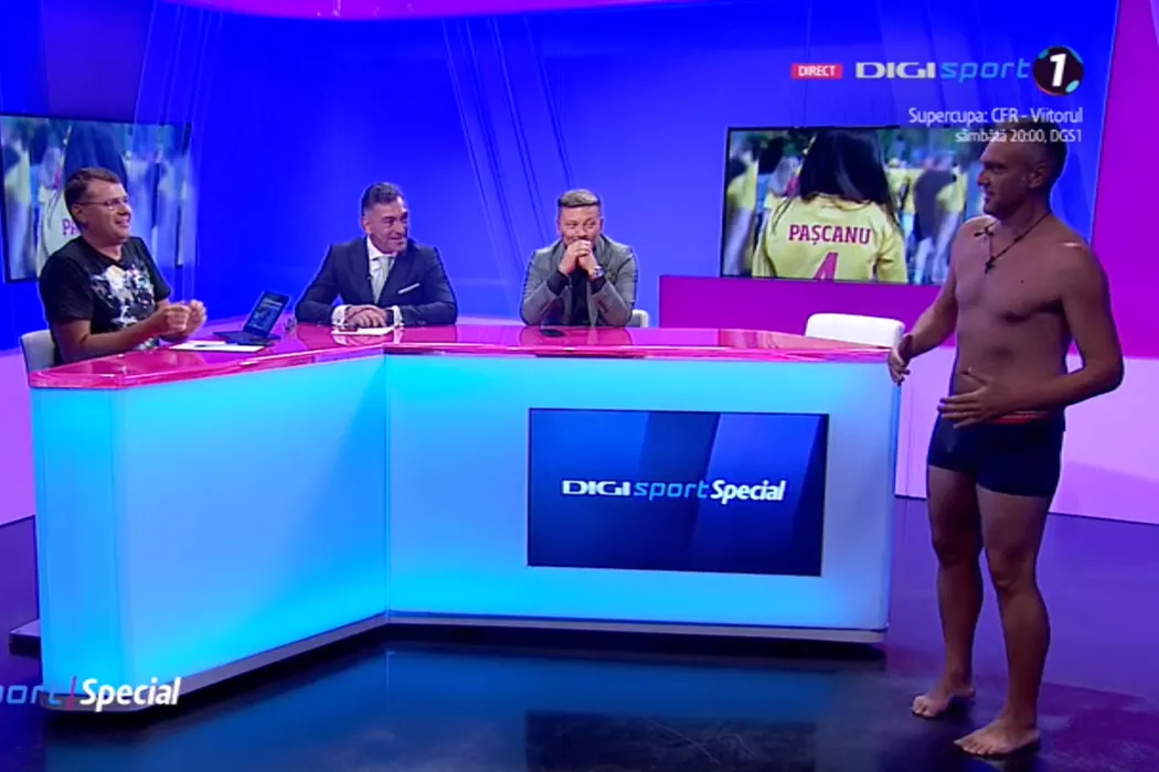 Apariție surprinzătoare la TV! Jurnalistul a apărut în lenjerie intimă, după ce a pierdut pariul cu Ilie Dumitrescu