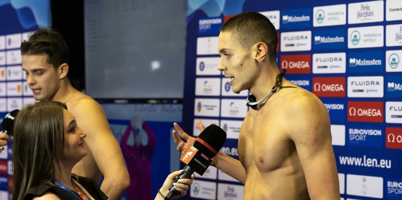 David Popovici dând un interviu după semifinala de la Campionatele europene de înot în bazin scurt 2023, desfășurate la Complexul Sportiv de Natație din Otopeni, vinerii 8 decembrie 2023. © FOTO: Mihai NEACȘU/SPORT PICTURES