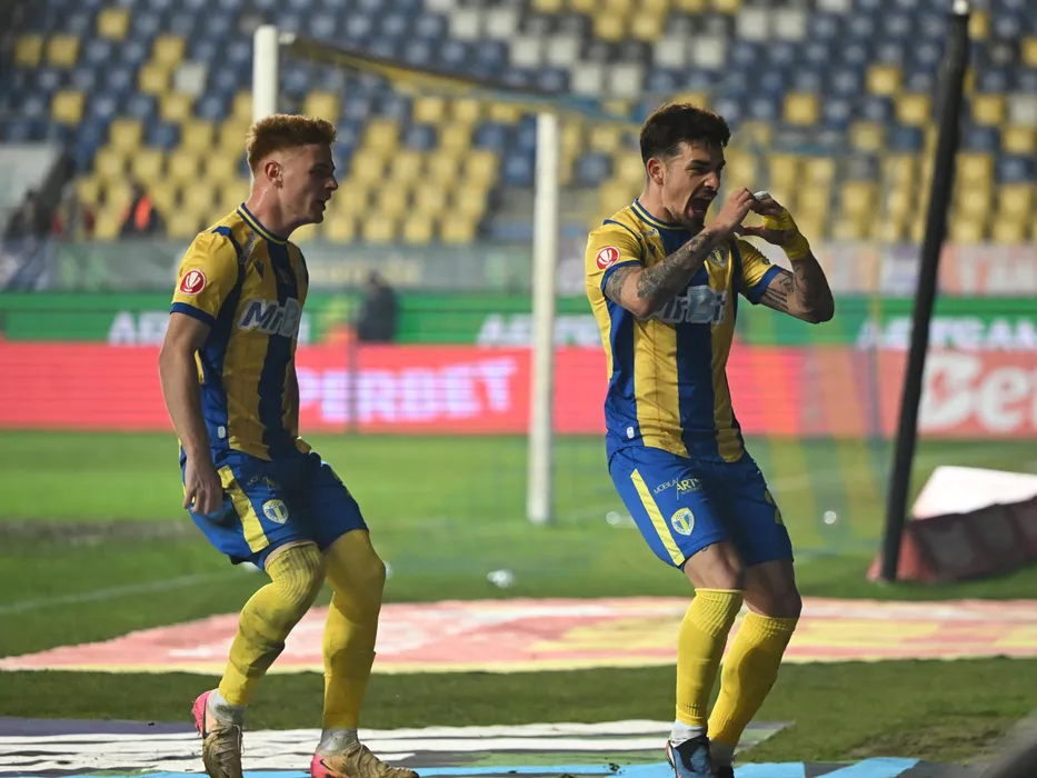 Fotbalistii ploiesteni Andres Mihai Dumitrescu si Sergiu Catalin Hanca se bucura dupa un gol marcat in meciul de fotbal dintre Petrolul Ploiesti si FC Arges, contand pentru Superliga Superbet, desfasurat pe Stadionul Ilie Oana din Ploiesti, vineri 13 februarie 2026. © FOTO:Razvan Pasarica/SPORT PICTURES