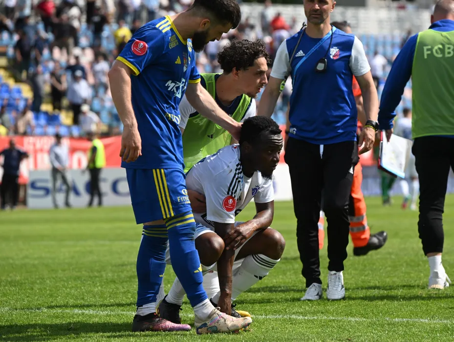 Hervin Ongenda imbarbat de Rassambek Akhmatov si Jaly Mouaddib dupa ratarea penaltiului din meciul de fotbal dintre FC Botosani si AFC Unirea 04 Slobozia, contand pentru Superliga Superbet Play-Out, desfasurat pe Stadionul Municipal din Botosani, sambata 3 mai 2025. © FOTO: Tudi/SPORT PICTURES