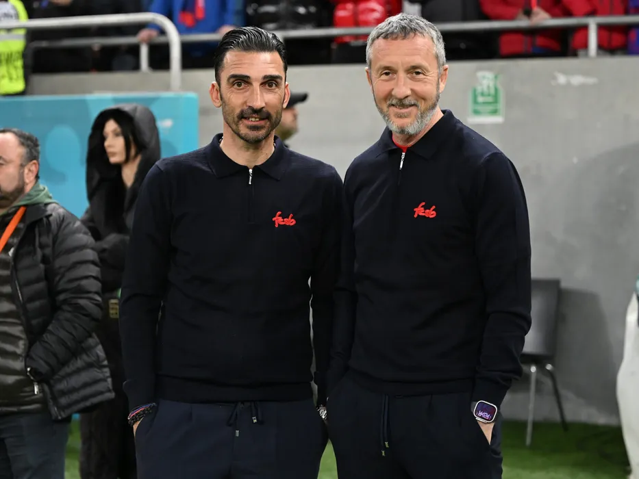 Elias Charalambous si Mihai Stoica discuta in startul meciului de fotbal dintre FCSB si Rapid Bucuresti, contand pentru Play off-ul Superligii Superbet, desfasurat pe Arena Nationala din Bucuresti, duminica 16 martie 2025. © FOTO:Razvan Pasarica/SPORT PICTURES