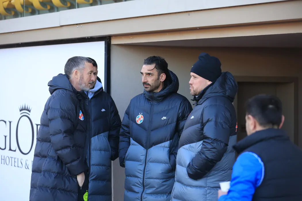 Mihai Stoica, Elias Charalambous si Doru Mihai Pintilii inaintea meciului amical de fotbal dintre FCSB si Besiktas Istanbul, desfasurat la Gloria Sports Arena din Antalya, vineri 9 ianuarie 2026. © FOTO:Aleksandar Djorovic/SPORT PICTURES