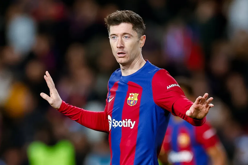 Robert Lewandowski of FC Barcelona gestures during the UEFA Champions League Round of 16 second leg match FC Barcelona vs SSC Napoli played at the Estadi Olimpic Lluis Companys in Barcelona, SPAIN - 12/03/2024 Photo Matteo Ciambelli / Sipa Press//CIAMBELLI__G1I4452/Credit:MATTEO CIAMBELLI/SIPA/2403122250,Image: 856318975, License: Rights-managed, Restrictions: , Model Release: no