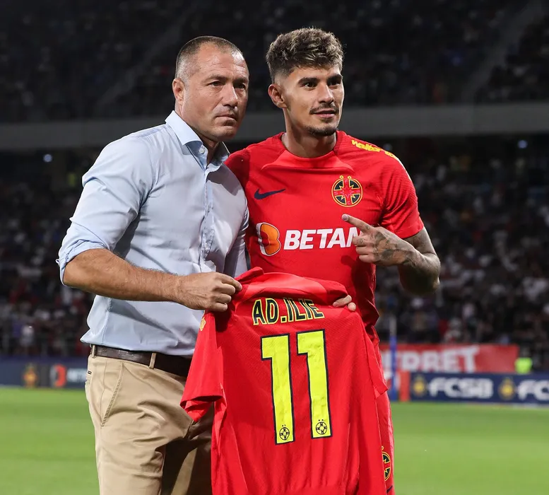Florinel Teodor Coman ii ofera un tricou lui Adrian Ilie inaintea meciului de fotbal dintre FCSB si CFR Cluj, din cadrul Superligii Superbet, desfasurat pe Stadionul Steaua-Ghencea din Bucuresti, duminica 6 august 2023. © FOTO:Antonio Vasile/SPORT PICTURES