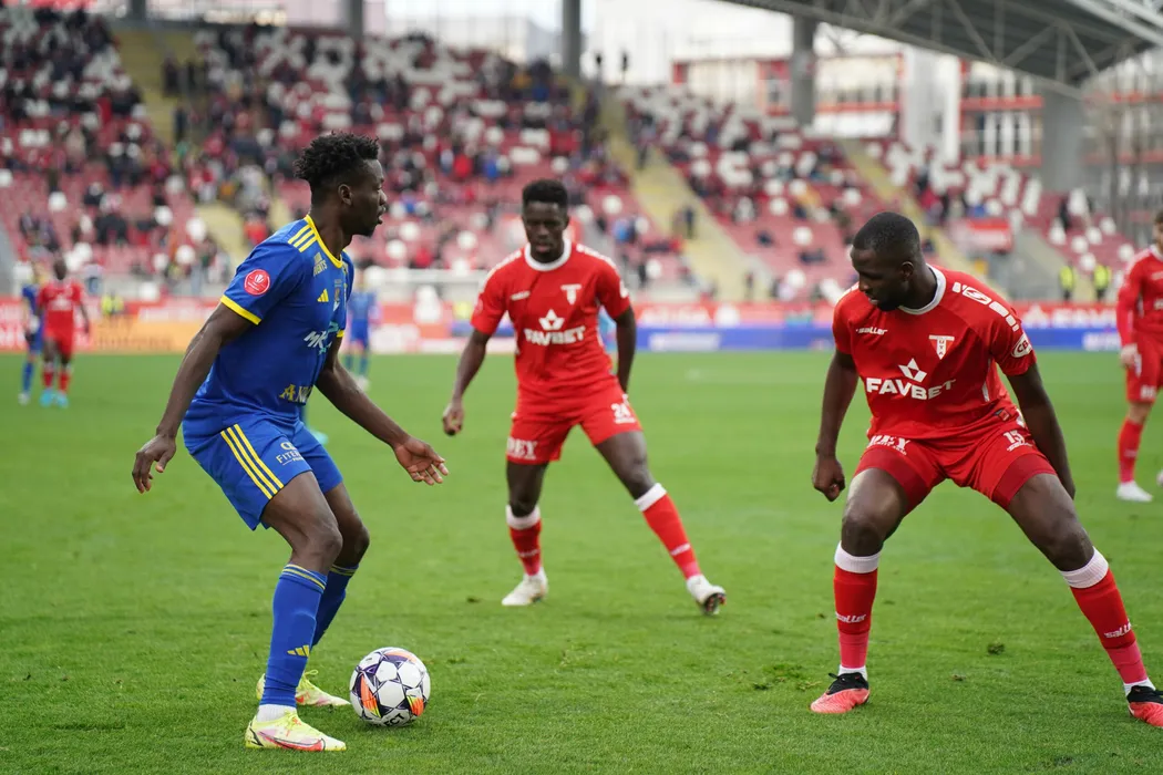 Nkama Christ Afalna și Ibrahima Sory Conte în meciul de fotbal dintre UTA Arad si AFC Unirea 04 Slobozia, contând pentru Superliga Superbet, desfășurat pe Arena Francisc Neuman din Arad, duminică 8 decembrie 2024. © FOTO: Alexandra FECHETE/SPORT PICTURES
