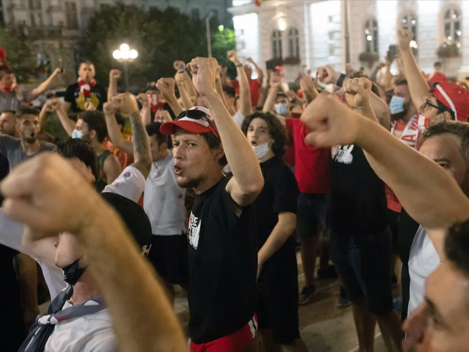 Suporterii echipei UTA Arad sarbatoresc promovarea echipei favorite dupa o pauza de 12 ani in prima liga in Piata din fata Primariei din Arad, duminica 2 august 2020. © FOTO:Ciprian Petcut/SPORT PICTURES