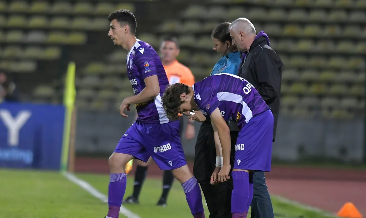 Arbitrul de rezerva Cristina Mariana Trandafir alaturi de fotbalistii argeseni aflati la debut pe prima scena fotbalistica a tarii Alexandru Mihail Crivac si Gino Stefan Oprescu in meciul de fotbal dintre FC Arges si FC Voluntari, contand pentru Play-off-ul Ligii 1 Casa Pariurilor, desfasurat pe Stadionul Nicolae Dobrin din Pitesti, luni 23 mai 2022. © FOTO:Razvan Pasarica/SPORT PICTURES