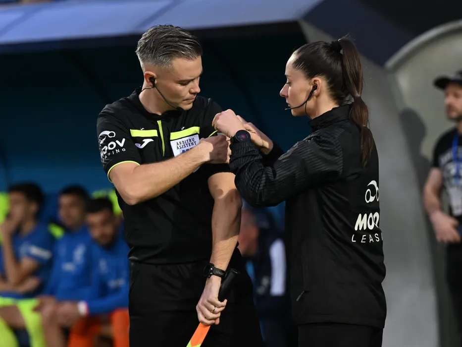 Arbitrul asistent Alexandru Voda si arbitrul de rezerva Iuliana Elena Demetrescu la meciul de fotbal dintre Farul Constanta si Politehnica Iasi, contand pentru Play-out-ul Superligii Superbet, desfasurat pe Stadionul central al Academiei Gheorghe Hagi din Ovidiu, sambata 15 martie 2025. © FOTO:Razvan Pasarica/SPORT PICTURES