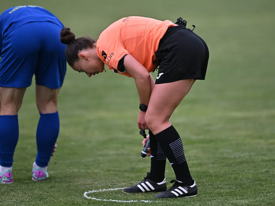 Arbitrul central Iuliana Elena Demetrescu reactioneaza in meciul de fotbal dintre Unirea Slobozia si Corvinul Hunedoara, contand pentru Play off-ul Ligii a-2-a Casa Pariurilor, desfasurat pe Stadionul 1 Mai din Slobozia, sambata 4 mai 2024. © FOTO:Razvan Pasarica/SPORT PICTURES