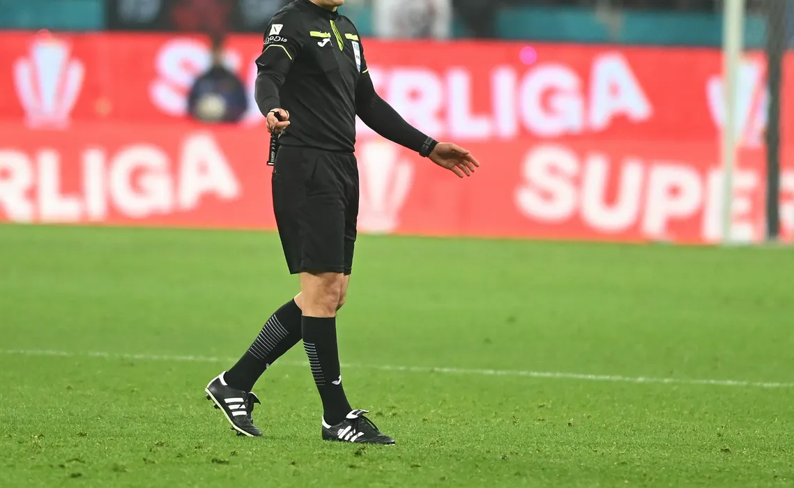 Arbitrul central Istvan Kovacs reactioneaza in meciul de fotbal dintre FCSB si CFR Cluj, contand pentru Superliga Superbet, desfasurat pe Arena Nationala din Bucuresti, joi 15 decembrie 2022. © FOTO:Razvan Pasarica/SPORT PICTURES