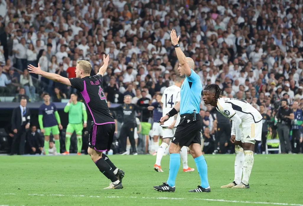 Schiedsrichter Szymon Marciniak pfeift und Matthijs de Ligt ist fassungslos, 104. Minute, Real Madrid vs. FC Bayern Muenchen, Championsleague-Halbfinale, Rueckspiel, Saison 2023-24, 8.5.2024, Real Madrid vs. FC Bayern Muenchen, Championsleague-Halbfinale, Rückspiel, Saison 2023-24, 8.5.2024, *** Referee Szymon Marciniak whistles and Matthijs de Ligt is stunned, 104 minutes, Real Madrid vs FC Bayern Muenchen, Champions League semi-final, second leg, 2023 24, 8 5 2024 season, Real Madrid vs FC Bayern Muenchen, Champions League semi-final, second leg, 2023 24, 8 5 2024 season, Copyright: xEibner-Pressefoto/joergxNiebergax EP_JNL,Image: 871344751, License: Rights-managed, Restrictions: Credit images as "Profimedia/ IMAGO", Model Release: no