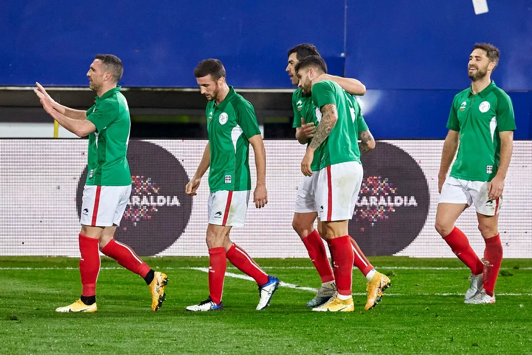 Unai Nuńez of Euskadi celebrates with his teammates during the friendly match between Euskadi and Costa Rica played at Ipurua Stadium on 16 November 2020 in Eibar, Spain.,Image: 569281532, License: Rights-managed, Restrictions: *** World Rights Except Japan, Spain, France and The Netherlands ***, Model Release: no