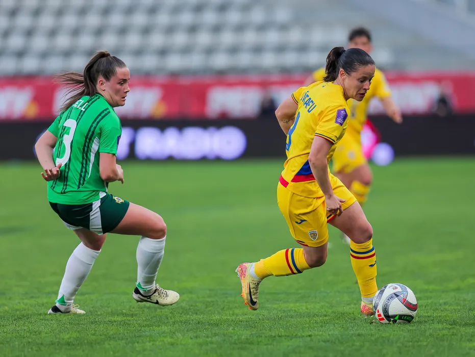 Stefania Vatafu si Megan Bell in meciul de fotbal feminin dintre Romania si Irlanda de Nord, contand pentru Liga Natiunilor Feminin 2025, desfasurat pe Stadionul Arcul de Triumf din Bucuresti, vineri 4 aprilie 2025. © FOTO: Mihai-Antonio Vasile/SPORT PICTURES
