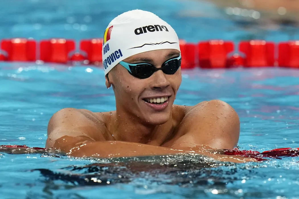 David Popovici, of Romania, reacts after his men's 100-meter freestyle semifinal at the 2024 Summer Olympics, Tuesday, July 30, 2024, in Nanterre, France.,Image: 894264578, License: Rights-managed, Restrictions: This content is intended for editorial use only. For other uses, additional clearances may be required., Model Release: no, Pictured: David Popovici