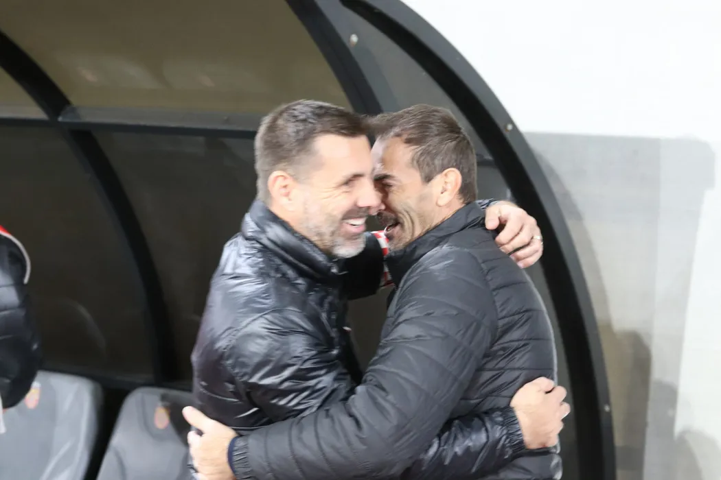 Cei doi antrenori Marius Măldărașanu și Zeljko Kopic se salută înaintea meciului de fotbal dintre AFC Hermannstadt Sibiu si Dinamo București, petru Superliga Superbet, desfășurat pe Stadionul Municipal din Sibiu, sâmbătă 26 octombrie 2024. © FOTO: Valentin MACREA/SPORT PICTURES