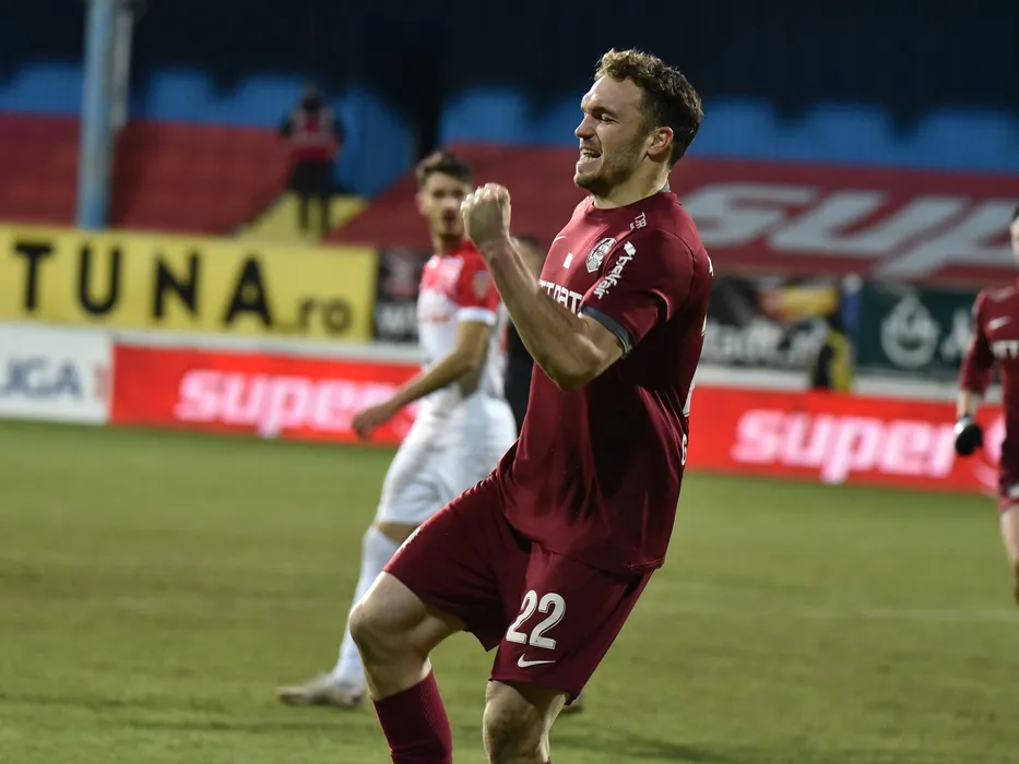 Gabriel Debeljuh se bucura dupa un gol marcat in meciul de fotbal dintre FC Hermannstadt si CFR Cluj, contand pentru Liga 1 Casa Pariurilor, desfasurat fara spectatori pe Stadionul Municipal din Medias, luni 25 ianuarie 2021. © FOTO:Alexandru Veres/SPORT PICTURES