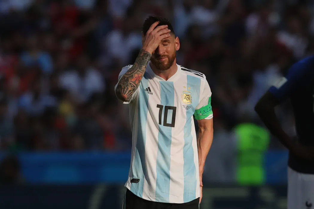 KAZAN, RUSSIA - JUNE 30: Lionel Messi of Argentina looks dejected during the 2018 FIFA World Cup Russia Round of 16 match between France and Argentina at Kazan Arena on June 30, 2018 in Kazan, Russia. (Photo by Alexander Hassenstein/Getty Images)