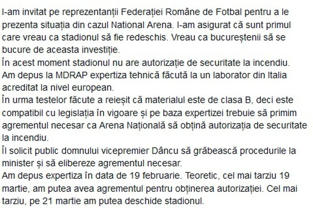Arena Națională s-ar putea redeschide până pe 21 martie. Anunțul făcut de primarul interimar al Bucureștiului. Amicalul cu Spania rămâne însă la Cluj