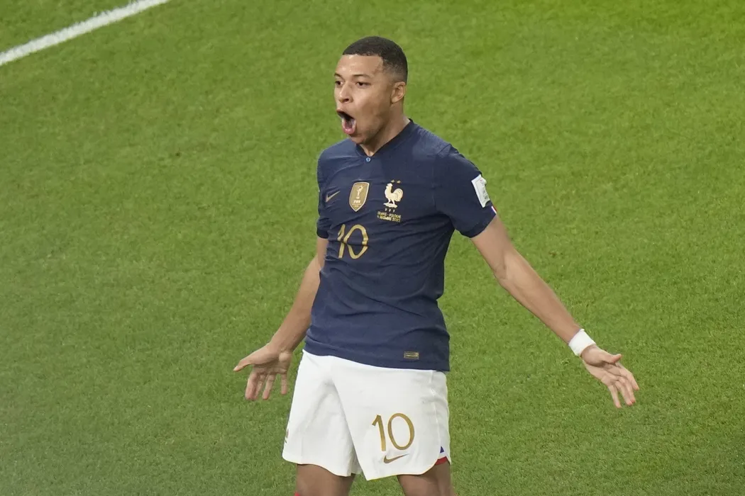 France's Kylian Mbappe, left, celebrates after scoring the third goal for his side during the World Cup round of 16 soccer match between France and Poland, at the Al Thumama Stadium in Doha, Qatar, Sunday, Dec. 4, 2022. (AP Photo/Luca Bruno)