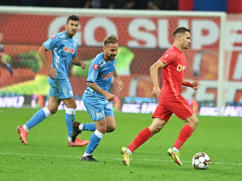 Juan Bautista Cascini si Darius Dumitru Olaru in meciul de fotbal dintre FCSB si UTA Arad, contand pentru Superliga Superbet, desfasurat pe Arena Nationala din Bucuresti, duminica 16 octombrie 2022. © FOTO:Razvan Pasarica/SPORT PICTURES