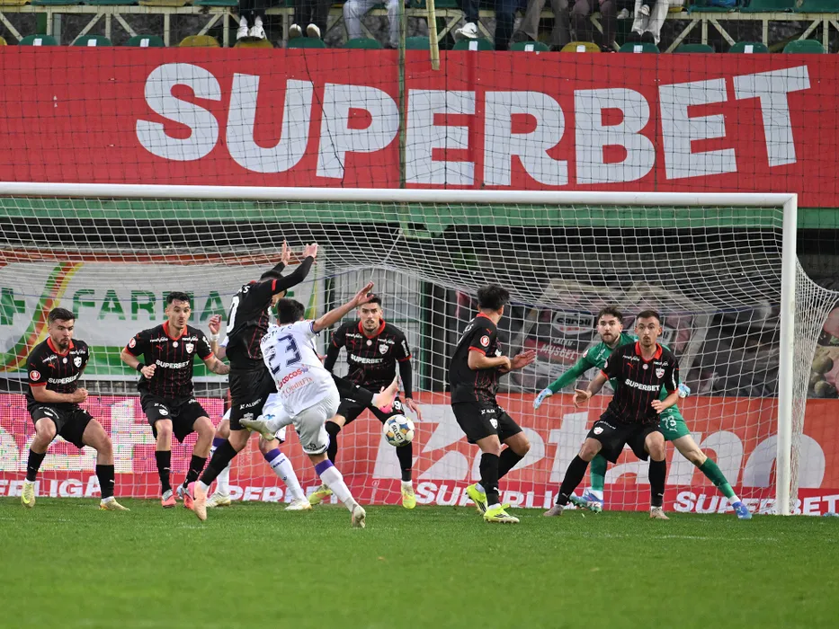 Danniel Charles Armstrong, Raul Marian Oprut, Iulius Andrei Marginean, Alexandru Vasile Rosca Ailisei si Nikita Stoinov la sutul lui Florin Gheorghe Borta din meciul de fotbal dintre FC Arges si Dinamo Bucuresti, contand pentru Play off-ul Superligii Superbet, desfasurat pe Stadionul Orasenesc din Mioveni, sambata 4 aprilie 2026. © FOTO:Razvan Pasarica/SPORT PICTURES