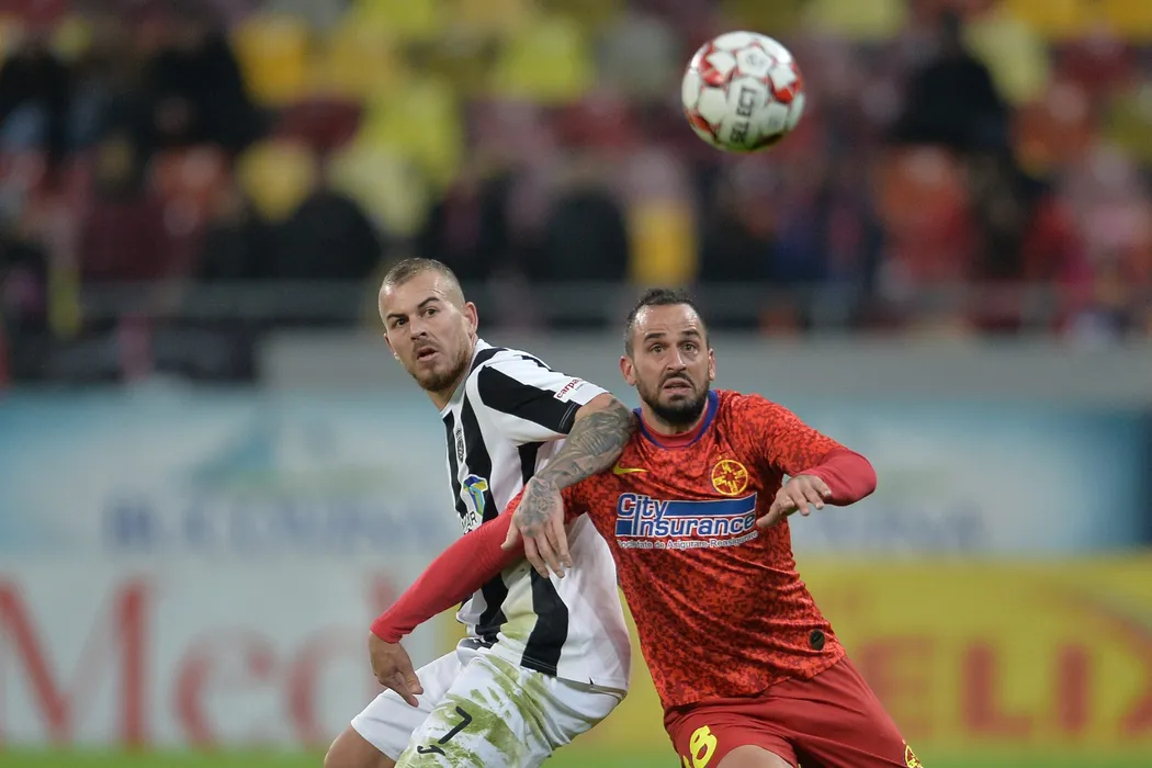 Aristides Soiledis (D), de FCSB, lupta pentru balon cu Denis Alibec (S), de la Astra Giurgiu, in timpul meciului de fotbal din etapa a XVII-a a Ligii 1, disputat pe Arena Nationala din Bucuresti, sambata, 23 noiembrie 2019. ALEXANDRU DOBRE / MEDIAFAX FOTO