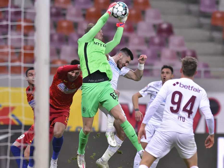 Adrian Gheorghe Sut, Olimpiu Vasile Morutan, Giedrius Arlauskis si Andrei Andonie Burca in meciul de fotbal dintre FCSB si CFR Cluj, contand pentru Liga 1 Casa Pariurilor, desfasurat fara spectatori pe Arena Nationala din Bucuresti, vineri 19 martie 2021. © FOTO:Razvan Pasarica/SPORT PICTURES