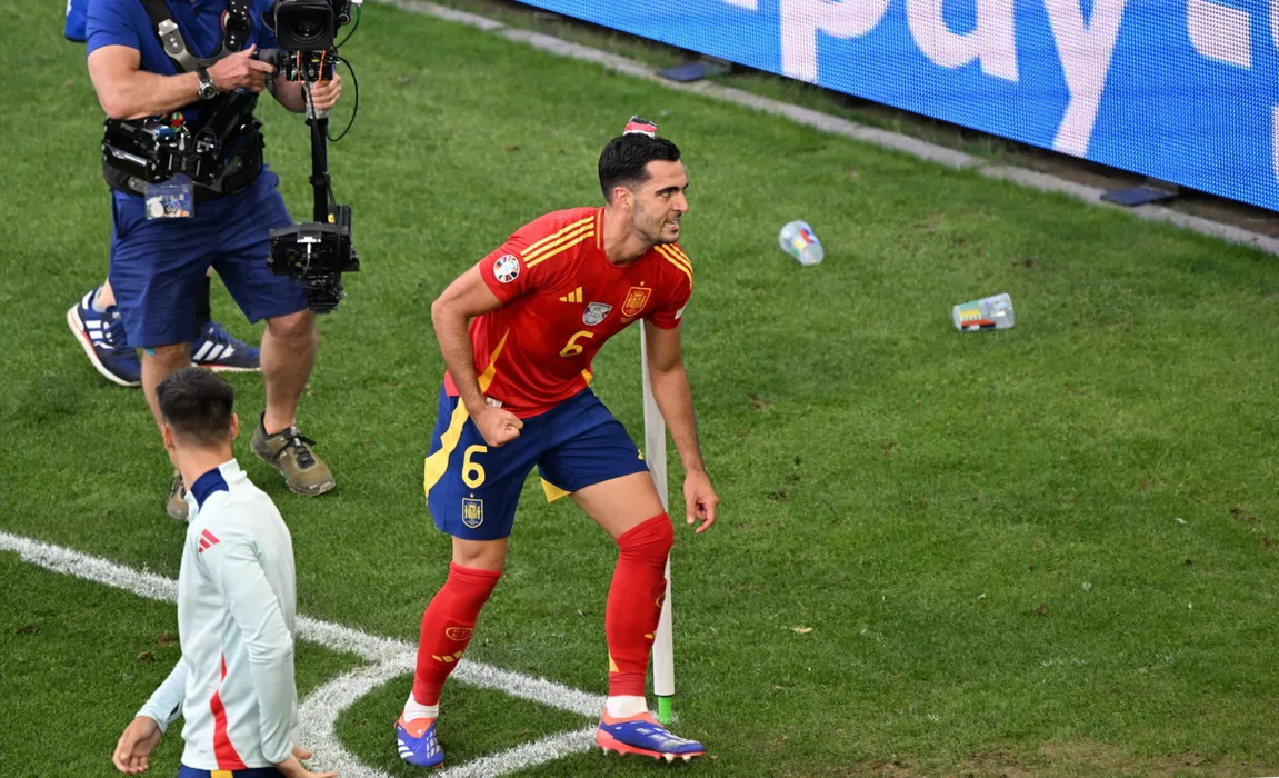 05 July 2024, Baden-Württemberg, Stuttgart: Spain's Mikel Merino celebrates their second goal during the UEFA EURO 2024 quarter-final soccer match between Spain and Germany at the MHP Arena. Photo: Bernd Weißbrod/dpa/HEPTA/SPORT PICTURES