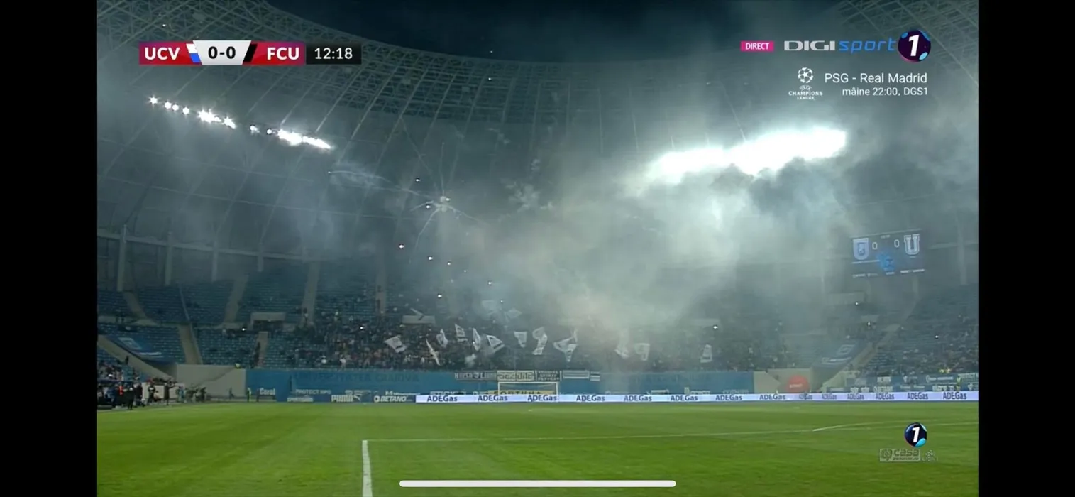 Numai oltenii puteau face așa ceva! Artificii în interiorul Stadionului „Ion Oblemenco” la meciul dintre Universitatea Craiova și FC U Craiova, care a fost întrerupt | FOTO & VIDEO