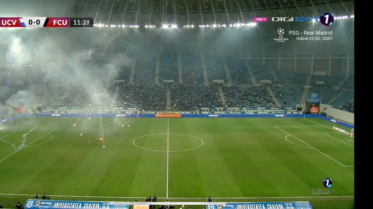 Numai oltenii puteau face așa ceva! Artificii în interiorul Stadionului „Ion Oblemenco” la meciul dintre Universitatea Craiova și FC U Craiova, care a fost întrerupt | FOTO & VIDEO