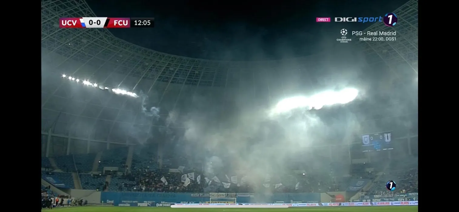 Numai oltenii puteau face așa ceva! Artificii în interiorul Stadionului „Ion Oblemenco” la meciul dintre Universitatea Craiova și FC U Craiova, care a fost întrerupt | FOTO & VIDEO