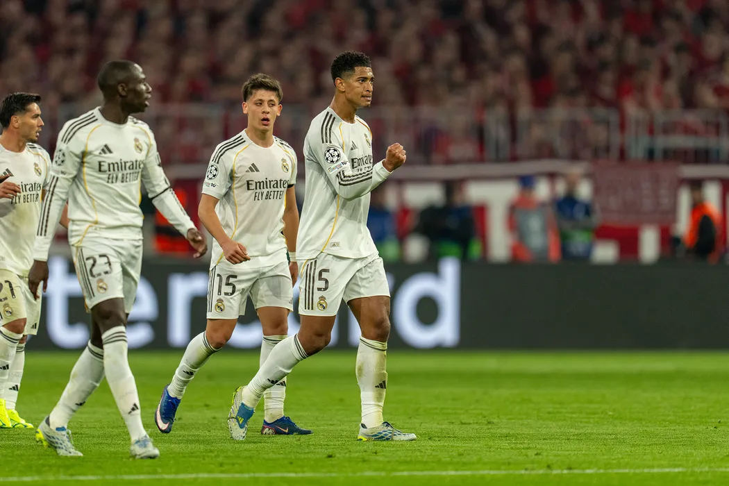 MUNICH, GERMANY - APRIL 15, 2026: Jude Bellingham of Real Madrid and Arda Güler of Real Madrid celebrates scoring a goal during the UEFA Champions League Quarter-Final second leg match between FC Bayern München and Real Madrid CF at Allianz Arena on April 15, 2026 in Munich, Germany. MARC MARASESCU / MEDIAFAX FOTO