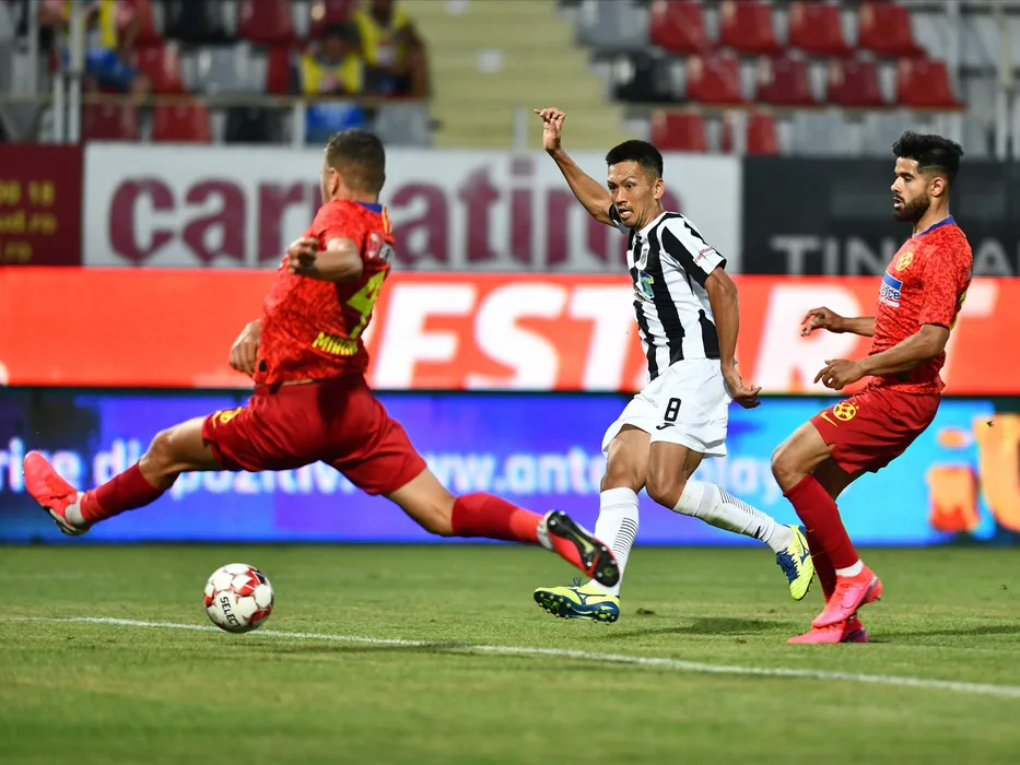 Seto Takayuki marcheaza un gol de langa Ionut Vina si George Andrei Miron in meciul de fotbal dintre Astra Giurgiu si FCSB, contand pentru play-off-ul Ligii 1 Casa Pariurilor, disputat fara spectatori pe Stadionul Marin Anastasovici din Giurgiu, luni 29 iunie 2020. © FOTO:Razvan Pasarica/SPORT PICTURES
