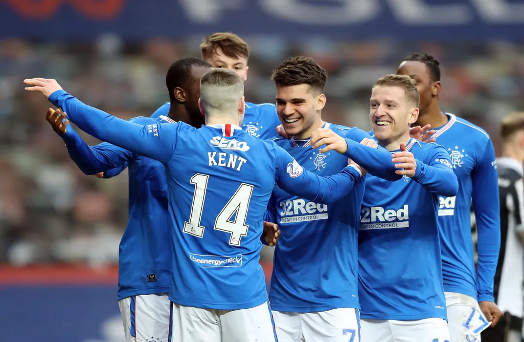 Rangers' Ianis Hagi celebrates scoring their side's third goal of the game with team-mates during the Scottish Premiership match at Ibrox Stadium, Glasgow. Picture date: Saturday March 6, 2021. (Photo by Jane Barlow/PA Images via Getty Images)