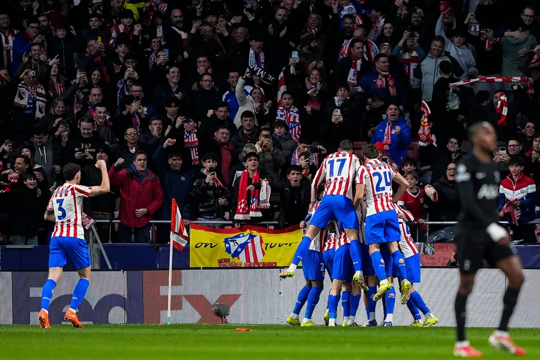 Marcos Llorente of Atletico de Madrid celebrates a goal with teammates during the UEFA Champions League 2025/26 Round of 16 First Leg match between Atletico de Madrid and Tottenham Hotspur at Riyadh Air Metropolitano on March 10, 2026, in Madrid, Spain.
