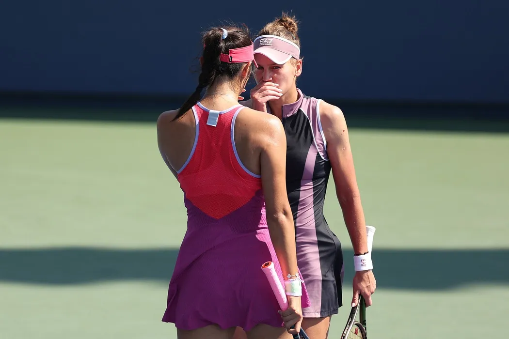NEW YORK, NEW YORK - AUGUST 28: Veronika Kudermetova (R) of Russia and Hao-Ching Chan Chinese Taipei in action against Elisabetta Cocciaretto of Italy and Clara Tauson of Denmark Taipei during their Women's Doubles First Round match on Day Three of the 2024 US Open at USTA Billie Jean King National Tennis Center on August 28, 2024 in the Flushing neighborhood of the Queens borough of New York City. Sarah Stier,Image: 902447882, License: Rights-managed, Restrictions: , Model Release: no