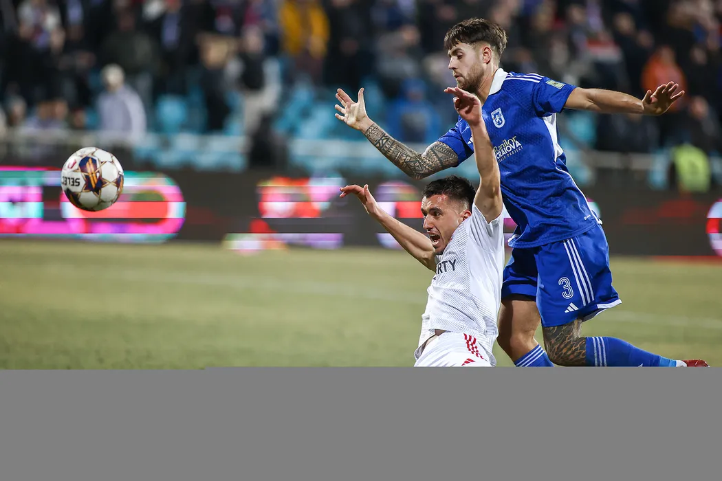 Anes Rusevic și Rokas Lekiatas în meciul de fotbal dintre SC Oțelul Galați si FCU 1948 Craiova, contând pentru Superliga Superbet, desfășurat pe Stadionul Oțelul din Galați, vineri 9 februarie 2024. © FOTO: Sorin PANĂ/SPORT PICTURES