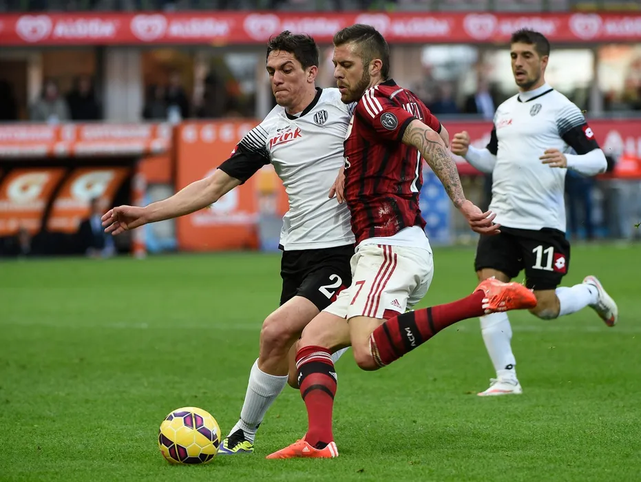AC Milan's midfielder from France Jeremy Menez (R) fights for the ball with Cesena's defender from Romanian Constantin Nica during the Italian Serie A football match AC Milan vs Cesena on February 22, 2015 at the San Siro Stadium stadium in Milan., Image: 219496443, License: Rights-managed, Restrictions: , Model Release: no, Credit line: OLIVIER MORIN / AFP / Profimedia