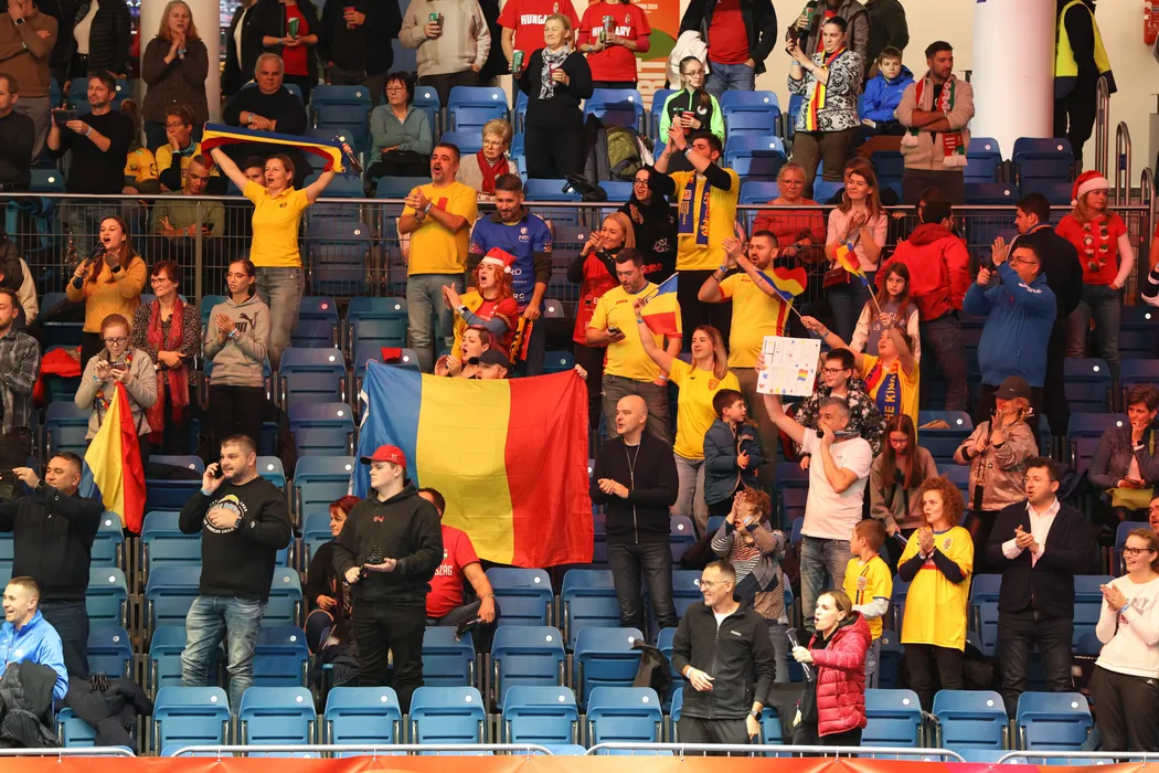 Suporterii români se bucură după victoria obținută în meciul de handbal dintre Suedia și România, contând pentru EHF EURO 2024, desfășurat in Sala Sporturilor Fönix Csarnok din Debrecen, vineri 6 decembrie 2024. © FOTO: Sorin PANĂ/SPORT PICTURES