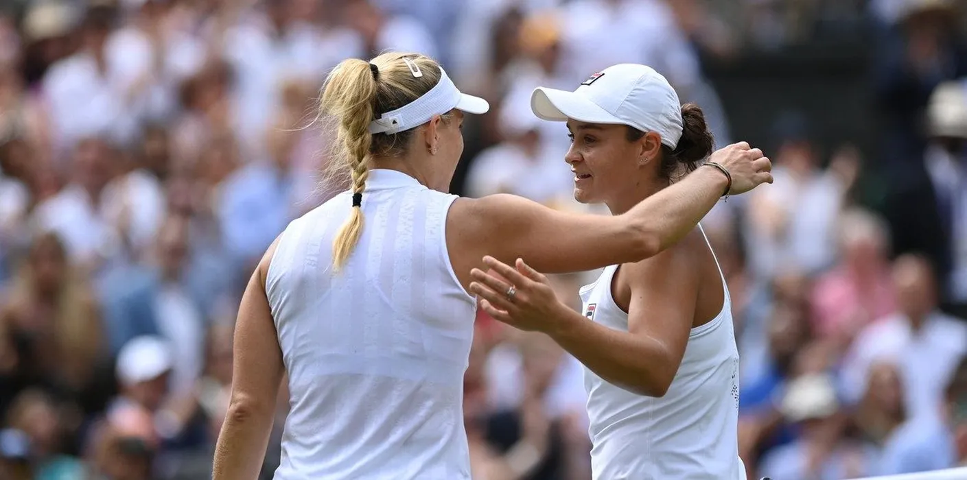 Australia's Ashleigh Barty (R) greets Germany's Angelique Kerber after winning their women's semi-final match on the tenth day of the 2021 Wimbledon Championships at The All England Tennis Club in Wimbledon, southwest London, on July 8, 2021.,Image: 620401666, License: Rights-managed, Restrictions: RESTRICTED TO EDITORIAL USE, Model Release: no, Credit line: Profimedia
