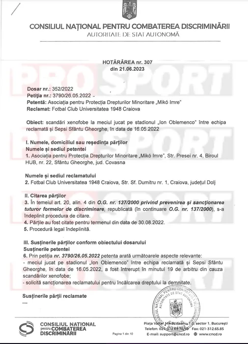 Asociația pentru Protecția Drepturilor Minoritare „Miko Imre” a câștigat procesul la CNCD cu FC U Craiova! Amendă uriașă pentru incidentele de la Sepsi. Avem documentul în care s-a folosit drept jurisprudență o decizie UEFA: „Sloganul «Afară, afară, cu ungurii din țară», scandat de suporterii români, are caracter rasist” | FOTO EXCLUSIV