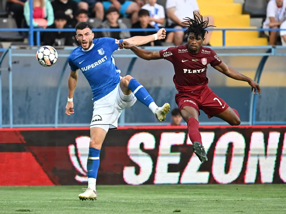 Mihai Popescu si Mohammed Kesselly Kamara in meciul de fotbal dintre Farul Constanta si CFR Cluj, contand pentru Superliga Superbet, desfasurat pe Stadionul central al Academiei Gheorghe Hagi din Ovidiu, duminica 1 septembrie 2024. © FOTO:Razvan Pasarica/SPORT PICTURES