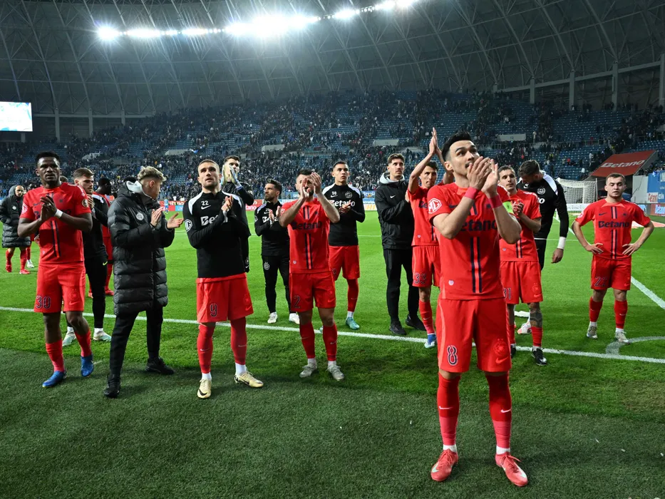 Fotbaliștii ros-albastrii Siyabonga Ngezana, Octavian George Popescu, George Daniel Bîrligea, Ionut Darius Cercel, George Daniel Bîrligea, Risto Radunovic, Juri Cisotti si Mihai Vlăduț Toma salută galeria după meciul dintre Universitatea Craiova si FCSB, contand pentru Play off-ul Superligii Superbet, desfasurat pe Stadionul Ion Oblemenco din Craiova, duminica 13 aprilie 2025. © FOTO:Razvan Pasarica/SPORT PICTURES