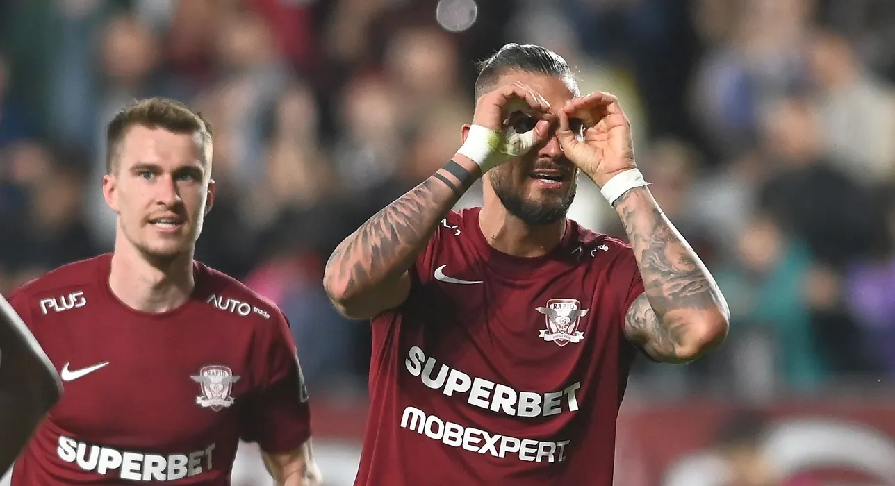 Marko Dugandzic se bucura dupa un gol marcat alaturi de Mattias Kait in meciul de fotbal dintre Rapid Bucuresti si CFR Cluj, contand pentru Play-off-ul Superligii Superbet, desfasurat pe Stadionul Rapid Giulesti din Bucuresti, duminica 1 mai 2023. © FOTO:Razvan Pasarica/SPORT PICTURES
