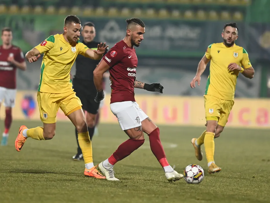 Mihai Daniel Lixandru si Marko Dugandzic in meciul de fotbal dintre CS Mioveni si Rapid Bucuresti, contand pentru Superliga Superbet, desfasurat pe Stadionul Orasenesc din Mioveni, 17 februarie 2023. © FOTO:Razvan Pasarica/SPORT PICTURES