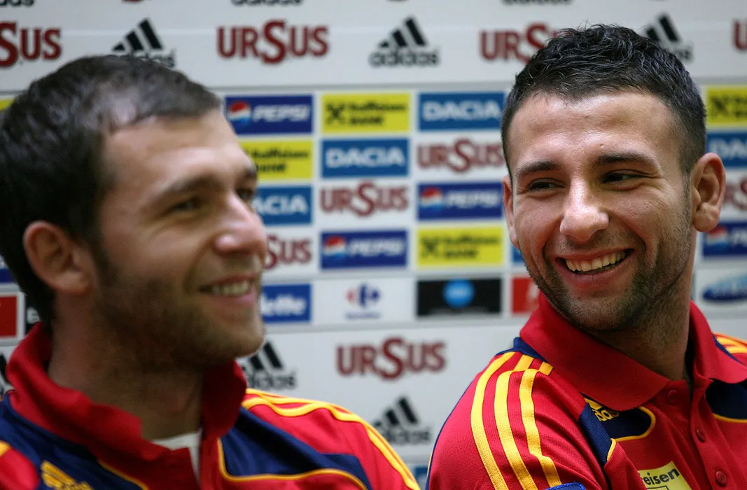 Portarul Bogdan Lobont (S) si Razvan Rat discuta in timpul unei conferinte de presa, la Centrul de Fotbal Mogosoaia, luni, 9 februarie 2009. CONSTANTIN VLADESCU / MEDIAFAX FOTO
