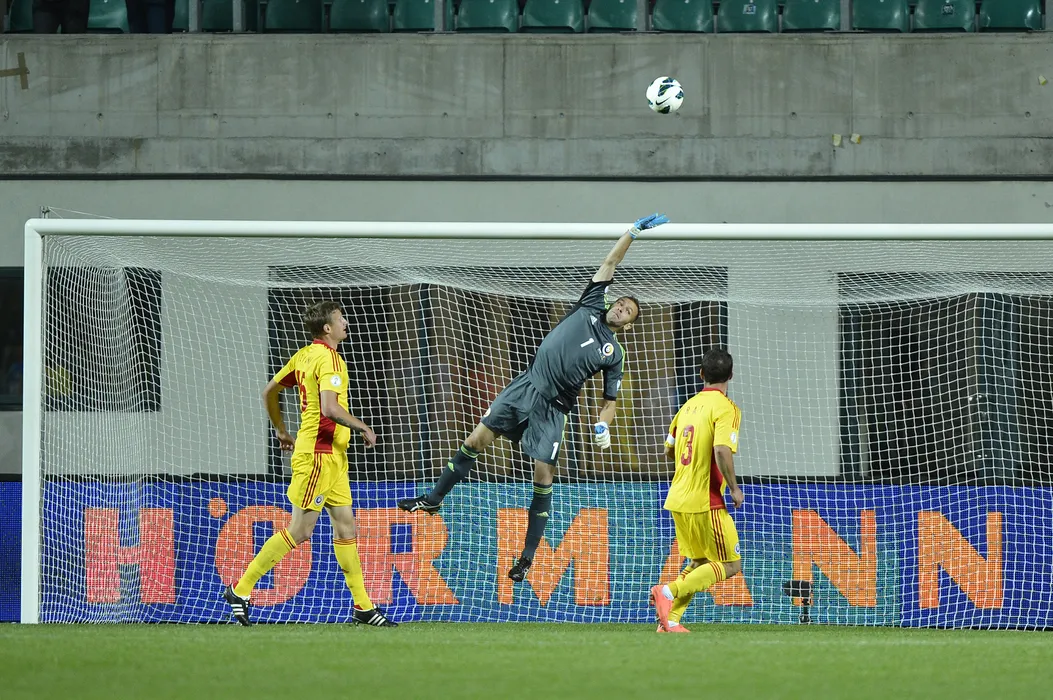 Bogdan Lobont (C), de la nationala de fotbal a Romaniei, sare in timpul meciului cu reprezentativa Estoniei, contand pentru preliminariile Campionatului Mondial 2014, disputat in Tallin, vineri, 7 septembrie 2012. ALEXANDRU HOJDA / MEDIAFAX FOTO