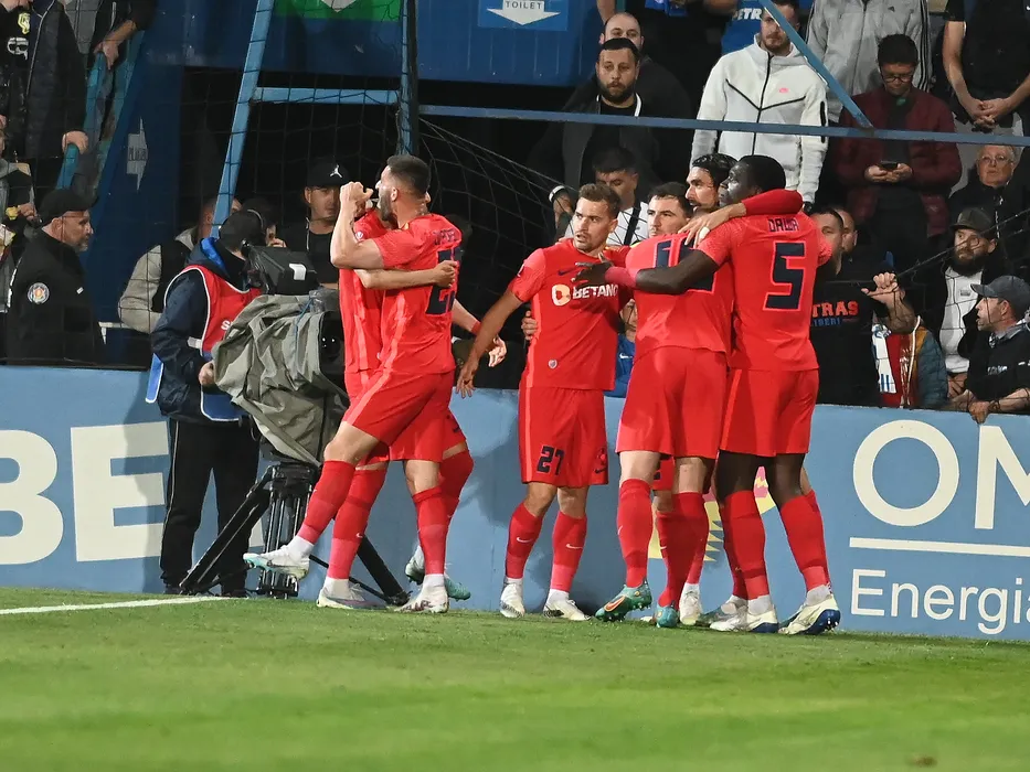 Bucurie a fotbalistilor stelisti dupa un gol marcat cu Ovidiu Marian Popescu, Darius Dumitru Olaru, Deian Cristian Sorescu, Andrea Compagno si Joyskim Aurelien Dawa Tchakonte in meciul de fotbal dintre Farul Constanta si FCSB, contand pentru Play-off-ul Superligii Superbet, desfasurat pe Stadionul central al Academiei Gheorghe Hagi din Ovidiu, duminica 21 mai 2023. © FOTO:Razvan Pasarica/SPORT PICTURES